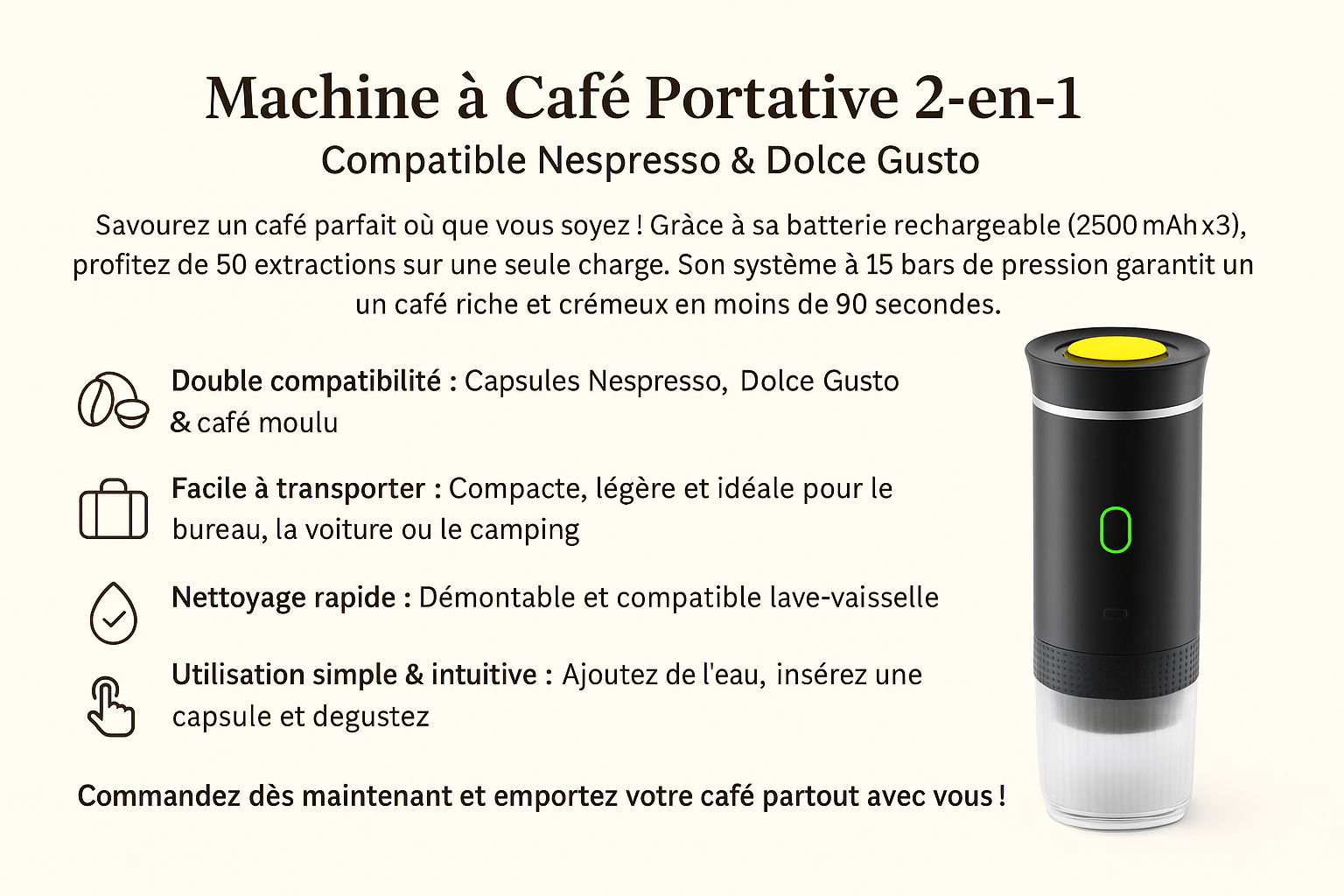 Savourez un café parfait où que vous soyez ! Grâce à sa batterie rechargeable (2500mAh x3) , profitez de 50 extractions sur une seule charge. Son système à 15 bars de pression garantit un café riche et crémeux en moins de 90 secondes .